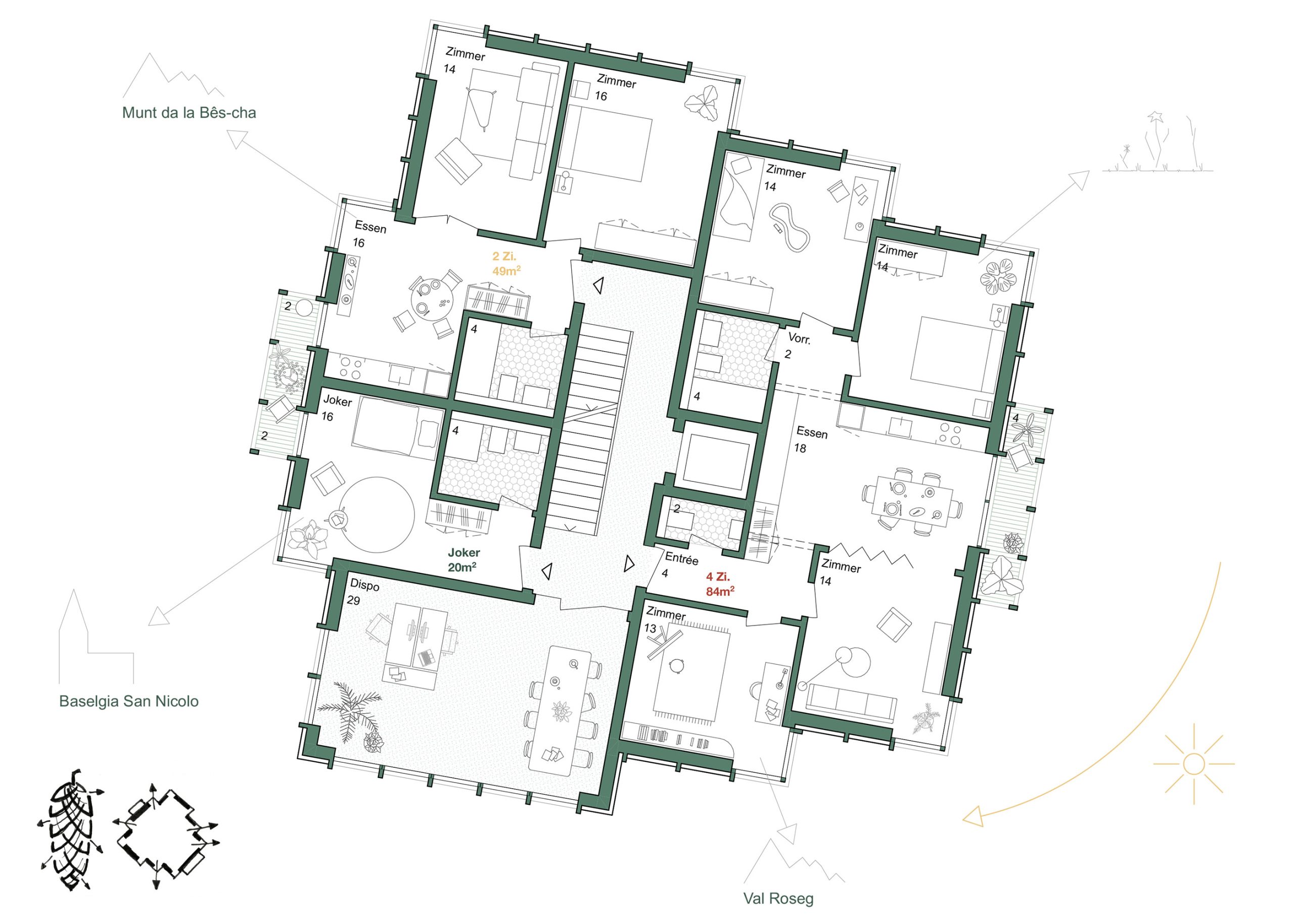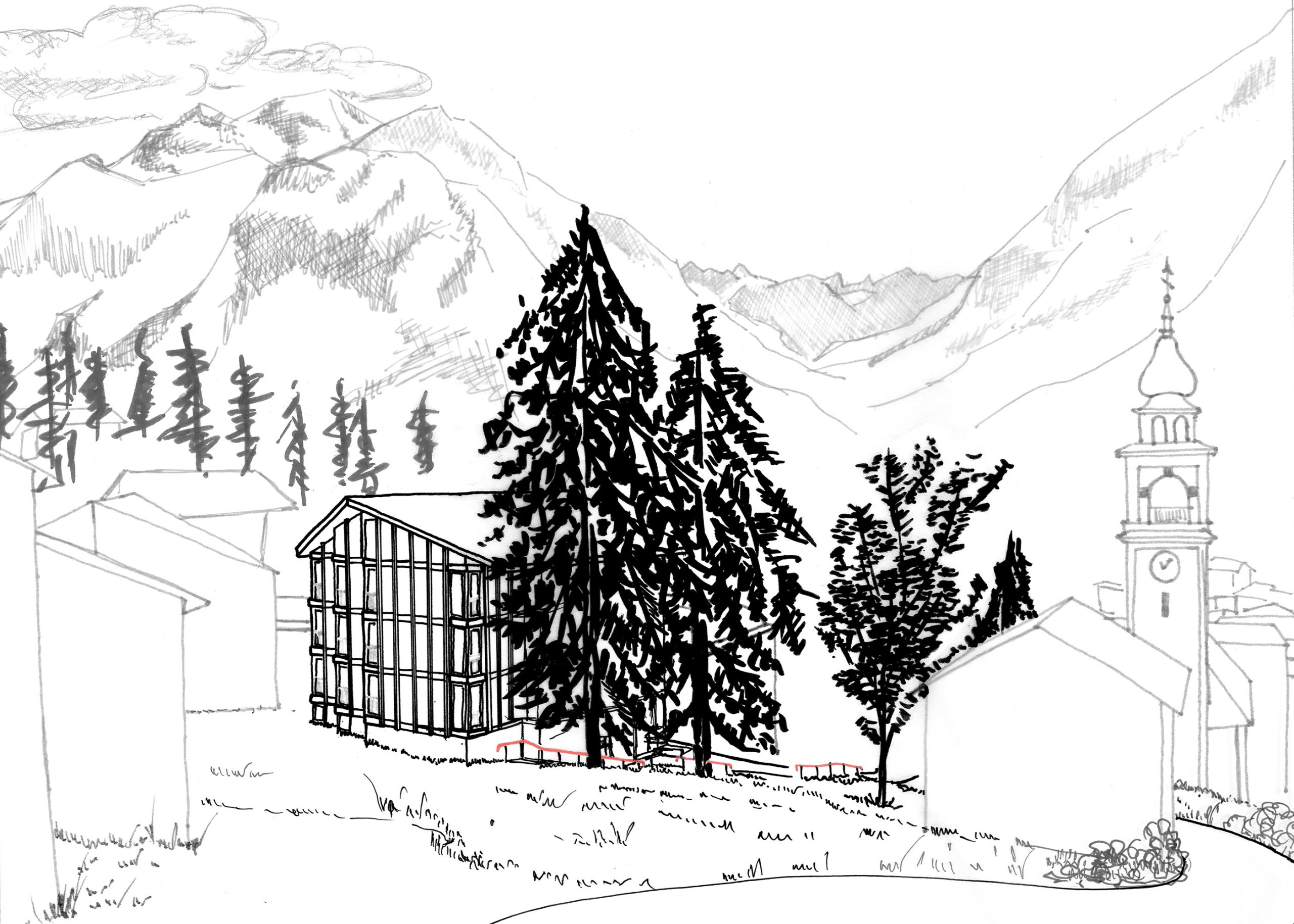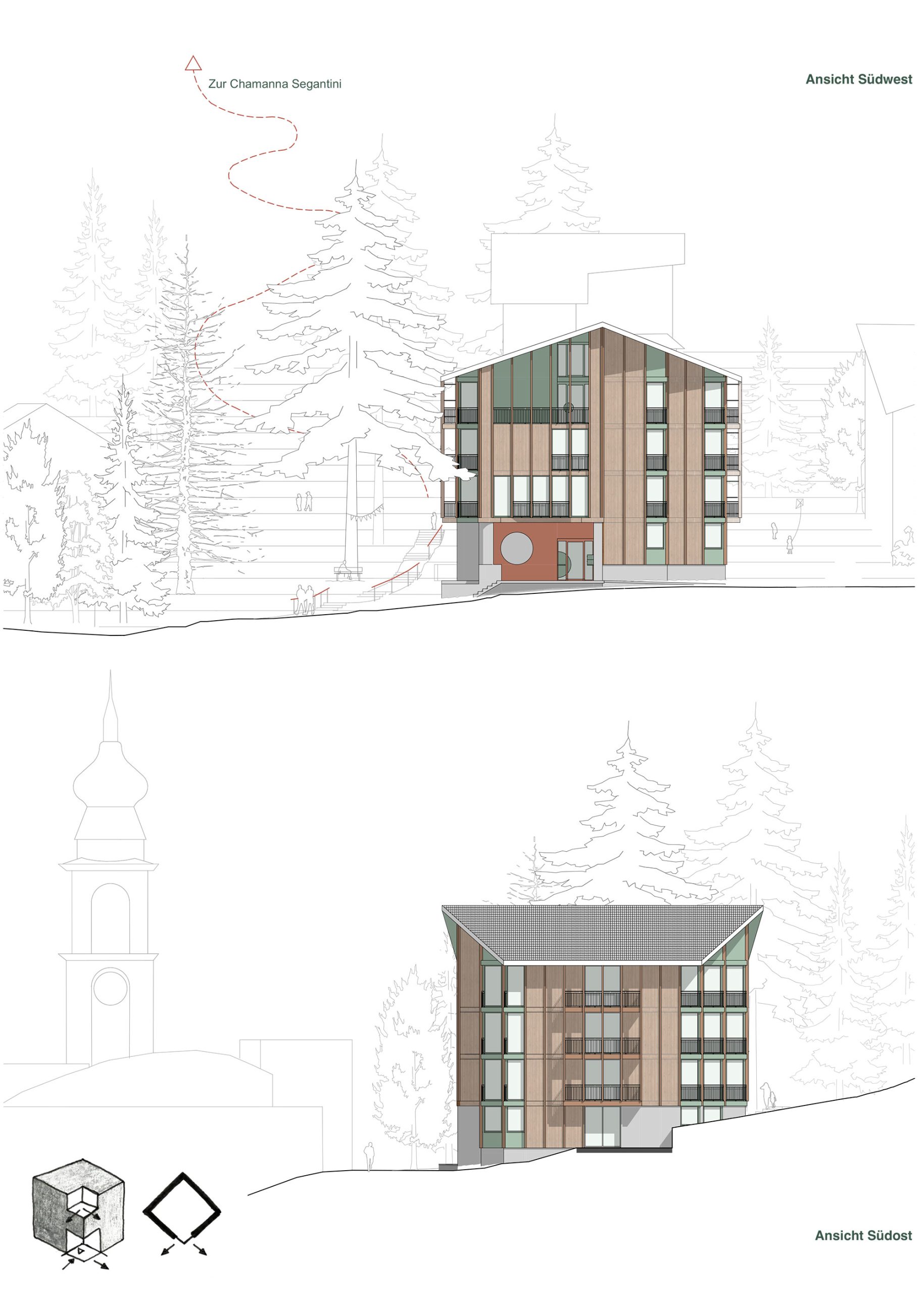 Die Typologie des Gebäudes verweist auf das Bild eines Tannenzapfens. Diese Anlehnung prägt sowohl die Volumetrie als auch die innere Struktur und Organisation des Volumens – eine feine Drehung, eine rhythmische Wiederholung, eine klare Mitte. So entsteht ein einfaches Haus, das nicht durch technische Komplexität, sondern auch durch architektonische Klarheit und Zurückhaltung nachhaltig ist.