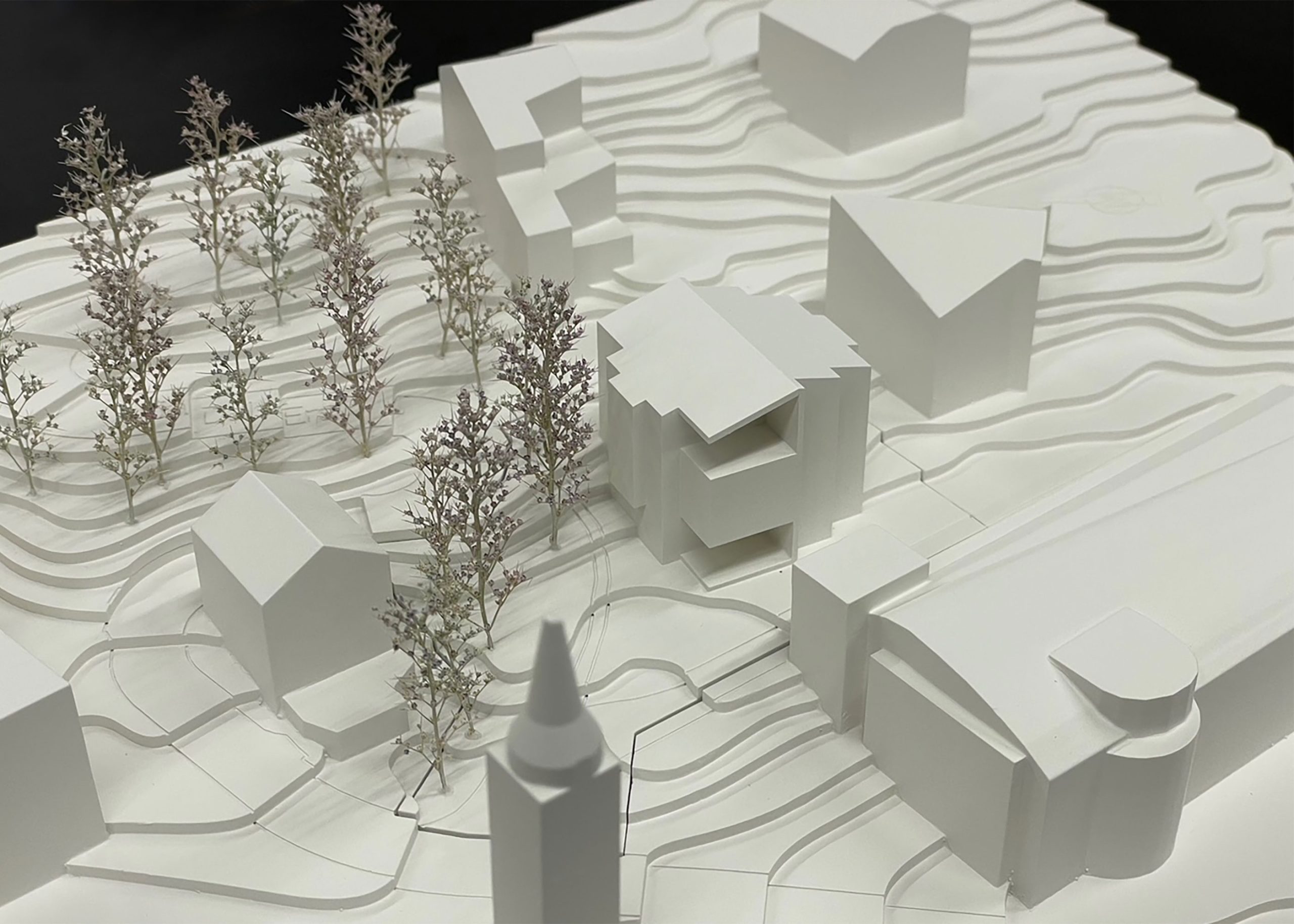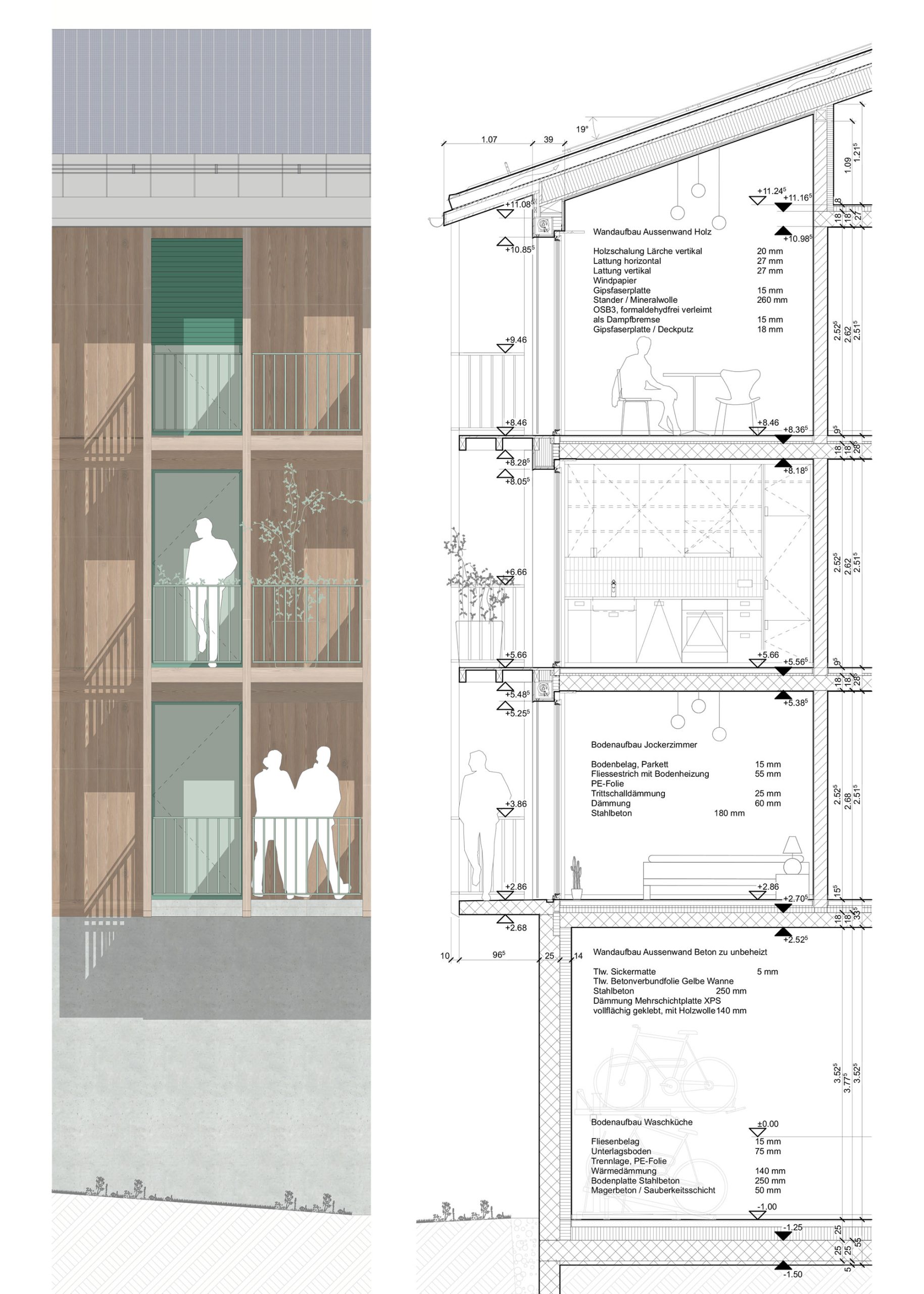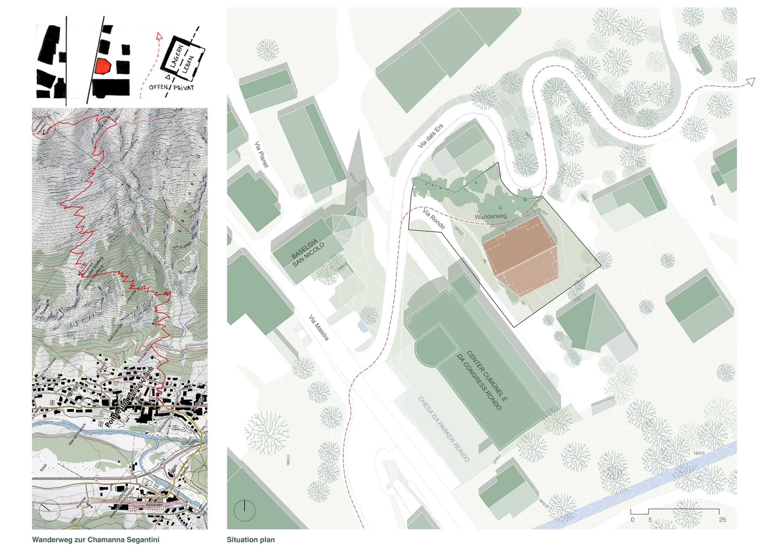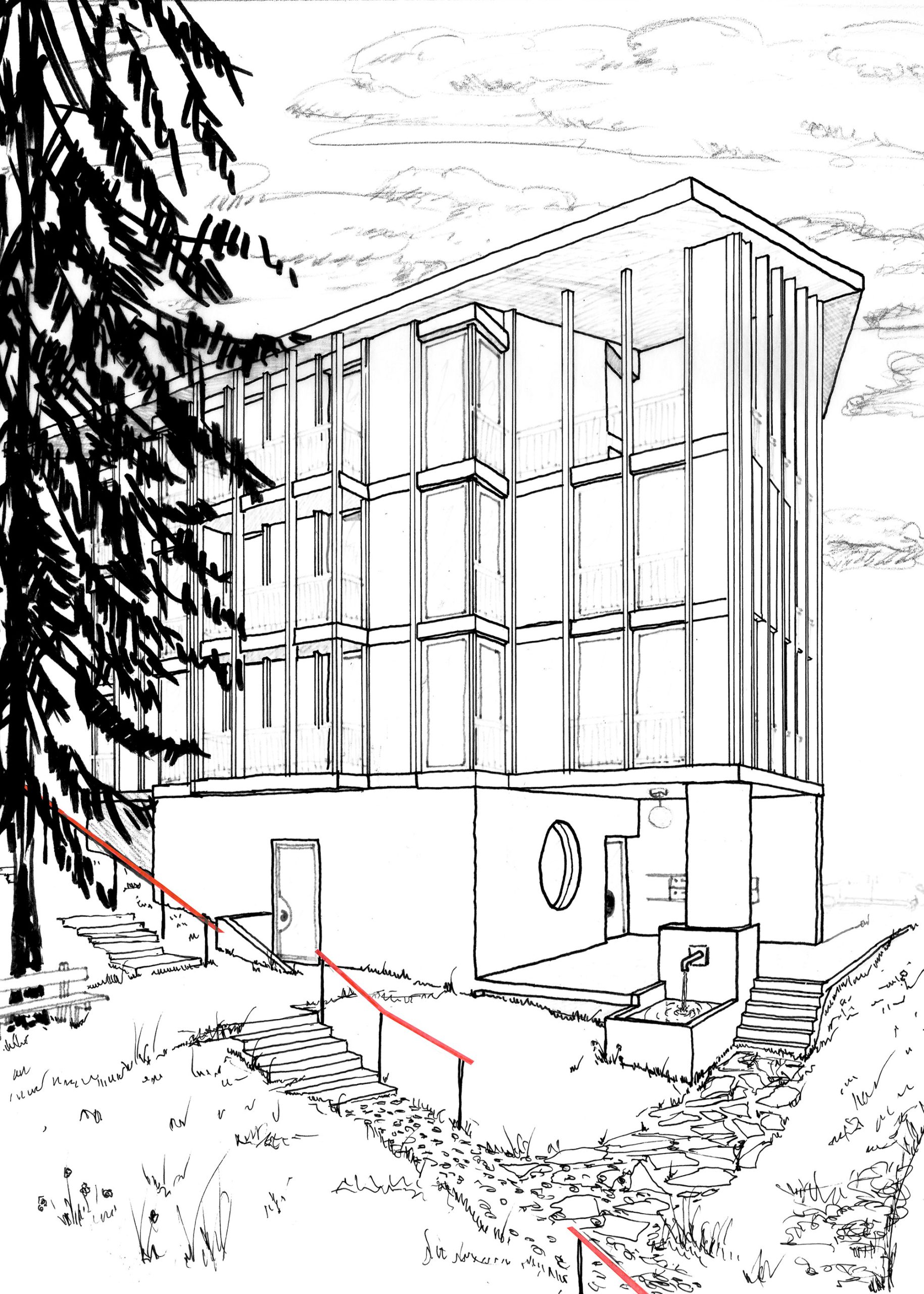Die Typologie des Gebäudes verweist auf das Bild eines Tannenzapfens. Diese Anlehnung prägt sowohl die Volumetrie als auch die innere Struktur und Organisation des Volumens – eine feine Drehung, eine rhythmische Wiederholung, eine klare Mitte. So entsteht ein einfaches Haus, das nicht durch technische Komplexität, sondern auch durch architektonische Klarheit und Zurückhaltung nachhaltig ist.